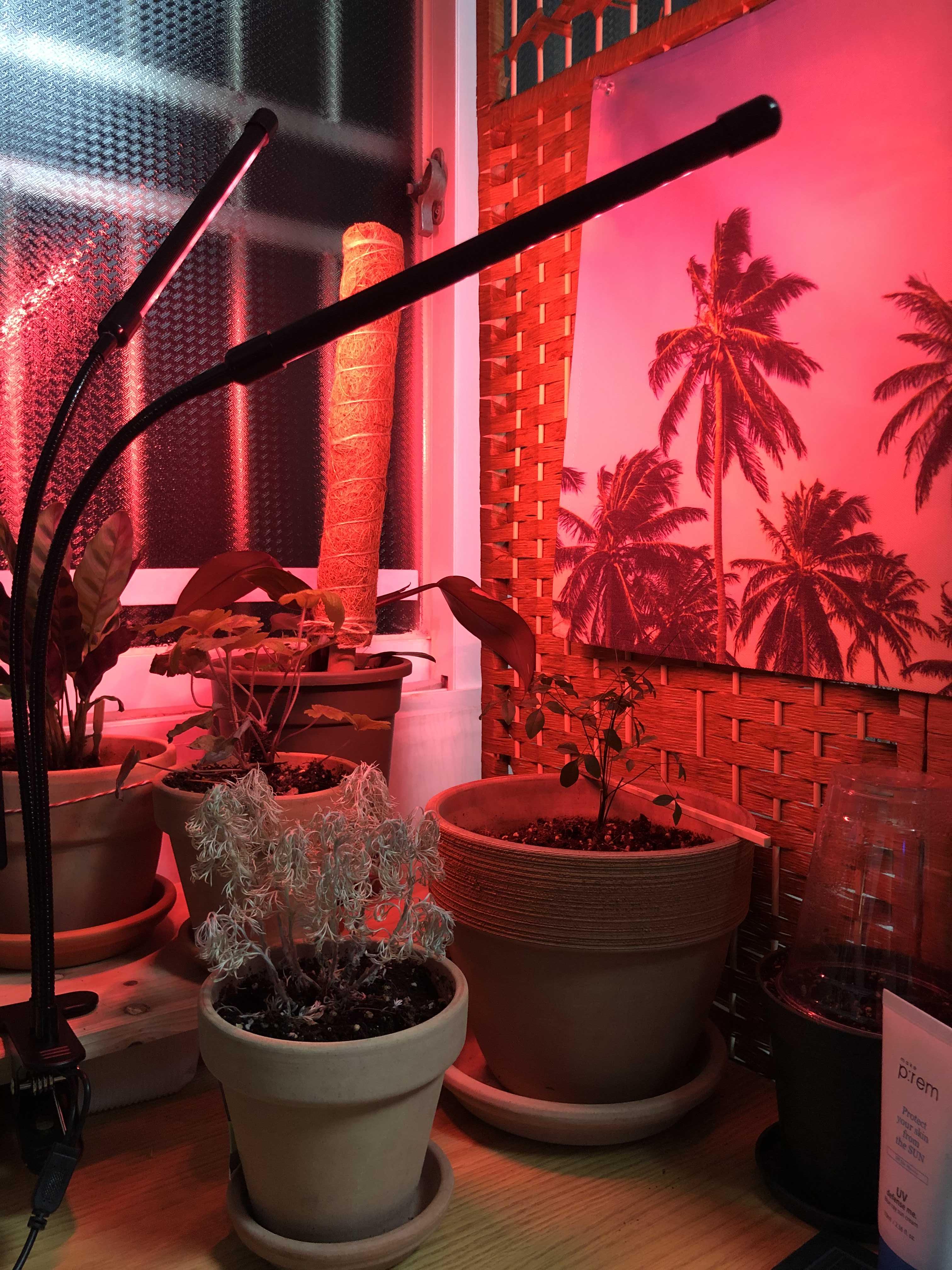 자바라형식으로 되어있어서 좀 걱정했는데 생각보다 짱짱한게 내가 원하는 모양을 잘 잡는다. 총 3가지 색의 빛을 쐬게할 수 있고 각 색상에 따라 식물에게 미치는 영향이 다르다. 빛의 밝기도 조정할 수 있다는 점이 장점. 참고로 식물등을 사용할때는 식물등과 식물의 거리를 너무 가깝게해서는 안된다. 너무 가까우면 식물의 잎이 타버리니 주의하도록해야한다. 50cm정도의 거리를 두고 사용하라고하는데, 나는 거리가 애매해서 빛의 세기를 조정해서 사용하고 있다.