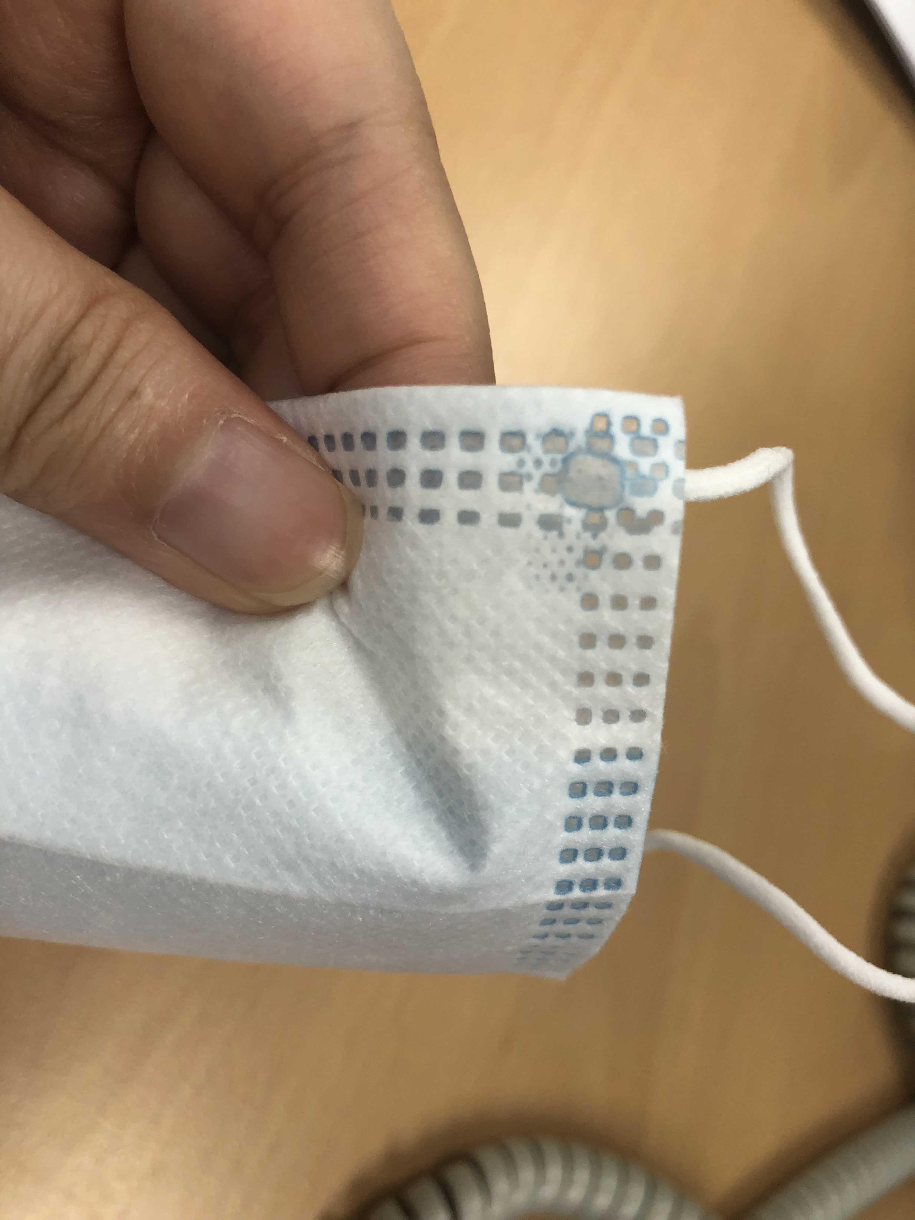 두번째 쉬운 방법입니다. 마스크의 끈에 접착된 부분을 살펴보면 됩니다. 자세히 보면 격자무늬 따위가 있어 끈이 눌린 자국이 있는 부분이 앞면, 격자 무늬가 없고 완전히 열에 녹아 눌린 부분이 뒷면입니다. 이 모양으로 구분하시면 됩니다. 하지만 이 부분도 애매한 경우가 있어서 가장 확실한 방법은 주름을 이용한 방법인데 3에 설명해두었습니다!