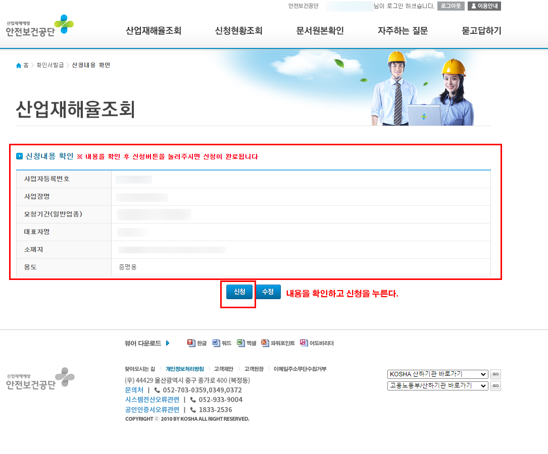 산업재해율 확인서 발급 - 한국산업안전보건공단